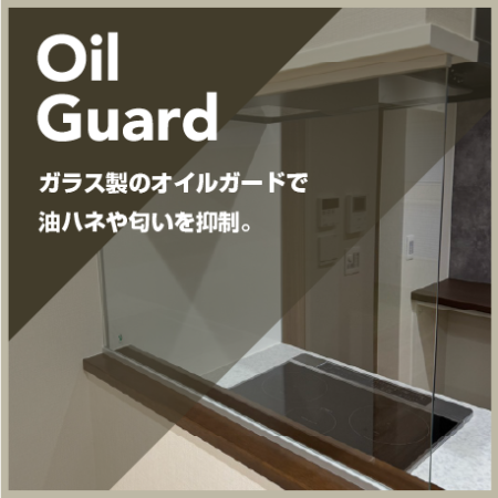 オープンキッチンの開放感を崩さず、油ハネや匂いの拡散を防ぐガラス製のオイルガード(キッチンガラスパネル)です。アクリル製でなくガラスを使用することで、長く透明感を維持できます。
